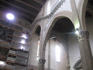 They were currently attempting to restore the basilica to its former, 15th century state by conducting work on the frescoes. As it is seen today, the walls are white and the brick is exposed. When it was constructed in 1442, all of the walls and brick arches would have been decorated in colorful frescoes. This next picture shows a restoration juxtaposed with the current state of preservation. The entire basilica would have had a completely different atmosphere.