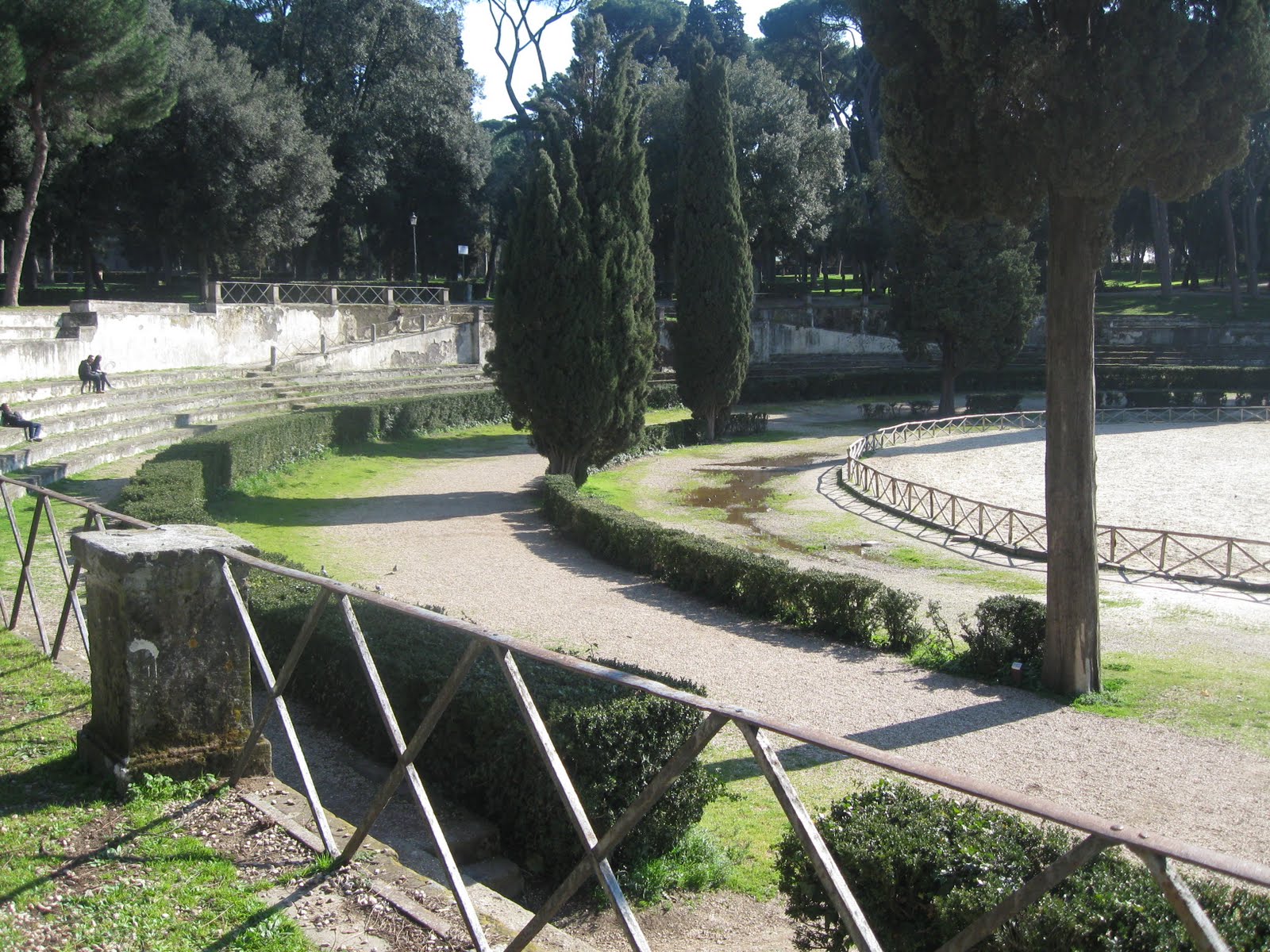 It had inspired me to discover some other parks in Rome. Last Friday, I wondered to the Villa Borghese. This park is much more popular than the other one and it is also more formally maintained. This park has many separate, distinct areas. There's an artificial lake on one side and a beautiful fountain on the other. There are vast open spaces and dense wooded areas. There's a zoo a cafe and a bunch of museums.