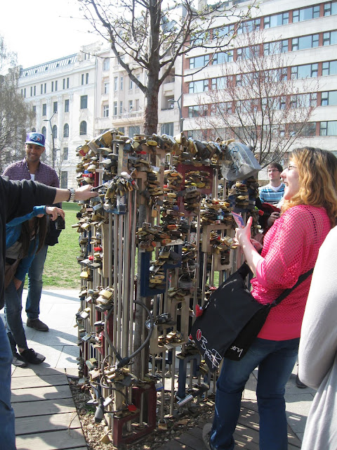 We moved through the park. To lighten the mood, our tour guide showed us the place where lovers lock their locks. I have seen this tradition in just about every European city I've been to, and each city claims to have started it.